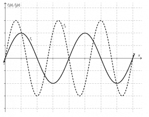 Die nachstehende Abbildung zeigt die Graphen der Funktionen $\hspace{0.1cm} f_1: \mathbb{R} \rightarrow \mathbb{R} \hspace{0.1cm}$ und $\hspace{0.1cm} f_2: \mathbb{R} \rightarrow \mathbb{R} \hspace{0.1cm}$ mit $\hspace{0.1cm} f_1(x)= a_1 · sin(b_1 ·x) \hspace{0.1cm}$ sowie $\hspace{0.1cm} f_2(x)= a_2 · sin(b_2 ·x) \hspace{0.1cm}$ mit $\hspace{0.1cm} a_1, a_2, b_1, b_2 >0$.