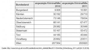 Die nachstehende Tabelle gibt an, wie viele Kriminalfälle in jedem Bundesland in Österreich in den Jahren 2010 und 2011 angezeigt wurden.