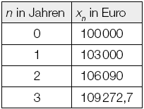 Ein Kapital von € 100.000 wird mit einem fixen jährlichen Zinssatz angelegt. Die nachstehende Tabelle gibt Auskunft über den Verlauf des Kapitals in den ersten drei Jahren. Dabei beschreibt $\hspace{0.1cm} x_n \hspace{0.1cm}$ das Kapital nach n Jahren (n ∈ ℕ).