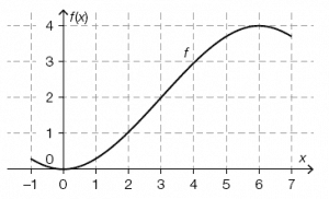 In der nachstehenden Abbildung ist der Graph einer Polynomfunktion f : ℝ → ℝ vom Grad 3 im Intervall [–1; 7] dargestellt. Alle lokalen Extremstellen sowie die Wendestelle von f im Intervall [–1; 7] sind ganzzahlig und können aus der Abbildung abgelesen werden.