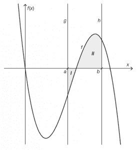 Die unten stehende Abbildung zeigt den Graphen der Funktion f : ℝ → ℝ und zwei markierte Flächenstücke. Der Graph der Funktion f, die x-Achse und die Gerade g mit der Gleichung x = a schließen das Flächenstück I mit dem Inhalt $\hspace{0.1cm} A_1 \hspace{0.1cm}$ ein. Der Graph der Funktion f, die x-Achse und die Gerade h mit der Gleichung x = b schließen das Flächenstück II mit dem Inhalt $\hspace{0.1cm} A_2 \hspace{0.1cm}$ ein.