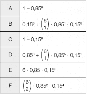 Ordnen Sie den vier Ereignissen jeweils denjenigen Term (aus A bis F) zu, der die Wahrscheinlichkeit des Eintretens dieses Ereignisses beschreibt!